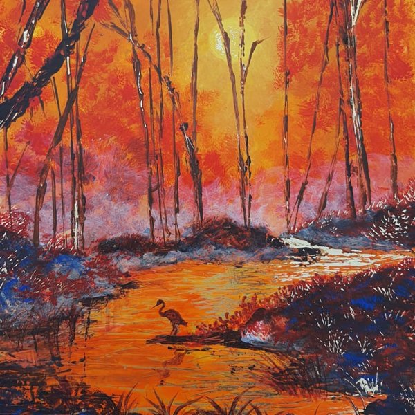 Bask in the warmth and beauty of “Sunlit Bloom,” a vibrant artwork that captures the essence of nature’s splendor. Tall trees adorned with orange flowers stretch towards the horizon, where a bright golden yellow sun shines: